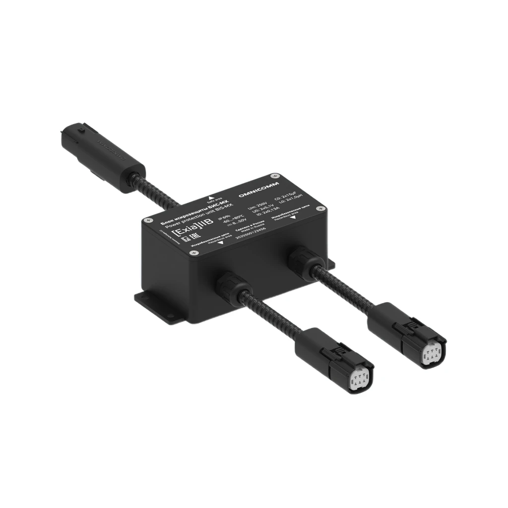 Omnicomm БИС-MX — блок искрозащиты, предназначенный для обеспечения безопасной работы датчиков уровня топлива и периферийного оборудования в транспортных средствах, перевозящих взрывоопасные грузы.